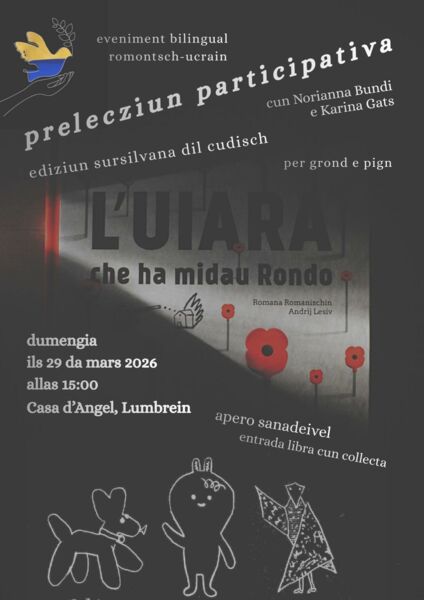 Partizipative Vorlesung vom Kinderbuch «L’uiara che ha midau Rondo» übersetzt ins Sursilvan von Kate Maļarenko. Das Bilderbuch wird zweisprachig und mit Hilfe des Publikums vorgelesen, mit den Schauspielerinnen Norianna Bundi und Karina Gats. Das Buch bietet Hilfe im Umgang mit dem Thema Krieg und Kindern. Vernissage mit gesundem Apéro und offener Diskussion. Herzliche Einladung an Gross und Klein!