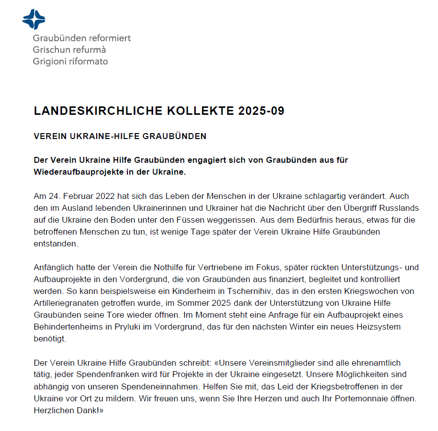 Die Evangelisch-reformierte Landeskirche Graubünden hat im August 2025 eine kantonale Kollekte für die Unterstützung des Vereins Ukraine Hilfe Graubünden lanciert.